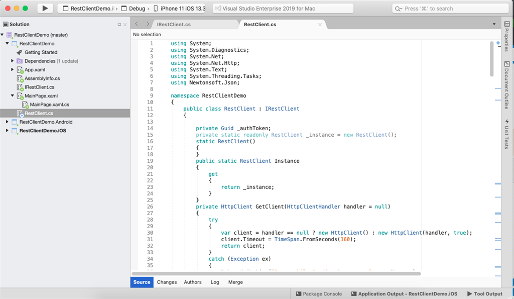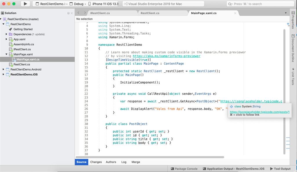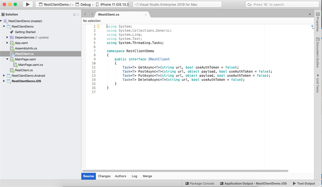 Step 1: Create a Visual studio solution for Xamarin application targetting Xamarin forms(can work for Xamarin native apps as well). Add an interface called as IRestClient as shown below:
