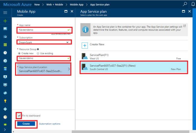In the next window that contains a form, specify the desired configuration for the Web+Mobile account (App name, location, and Resource group), and click "Pin to dashboard".