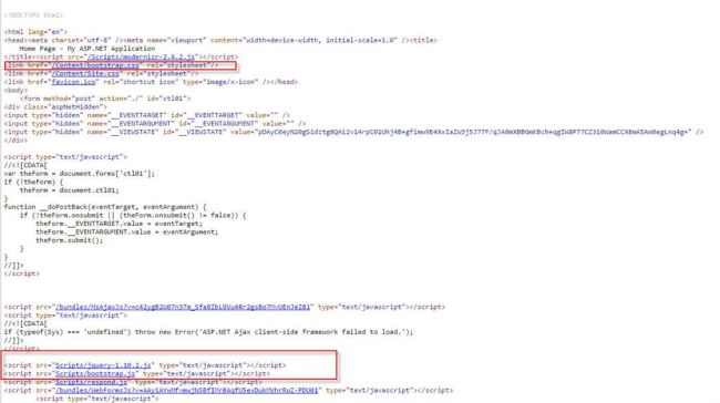 In this source file, we can see the rendered scripts and CSS files in the browser source.