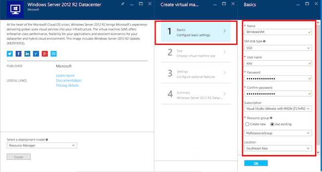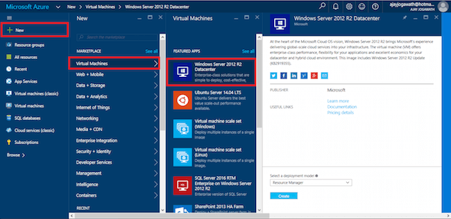 Azure Portal. Click New and select Virtual Machines. Select Windows Server 2012 R2 Data Center and don't forget to select Resource Manager as a deployment model.