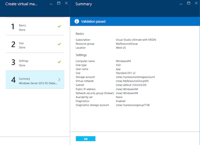 Click OK. Go to the last step, which is nothing but a summary of all the details of the Virtual Machine, we want to create. Once we click OK, the virtual machine will go for the deployment and when it is done, you will get a notification on Azure portal, that your Virtual Machine is successfully created and a message is called as validation passed.