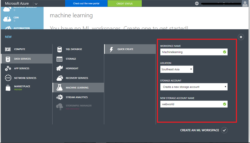 Step 2 - Now on to the home screen of Azure management portal select New -> Data services ->Machine Learning. And the window shown below appears.