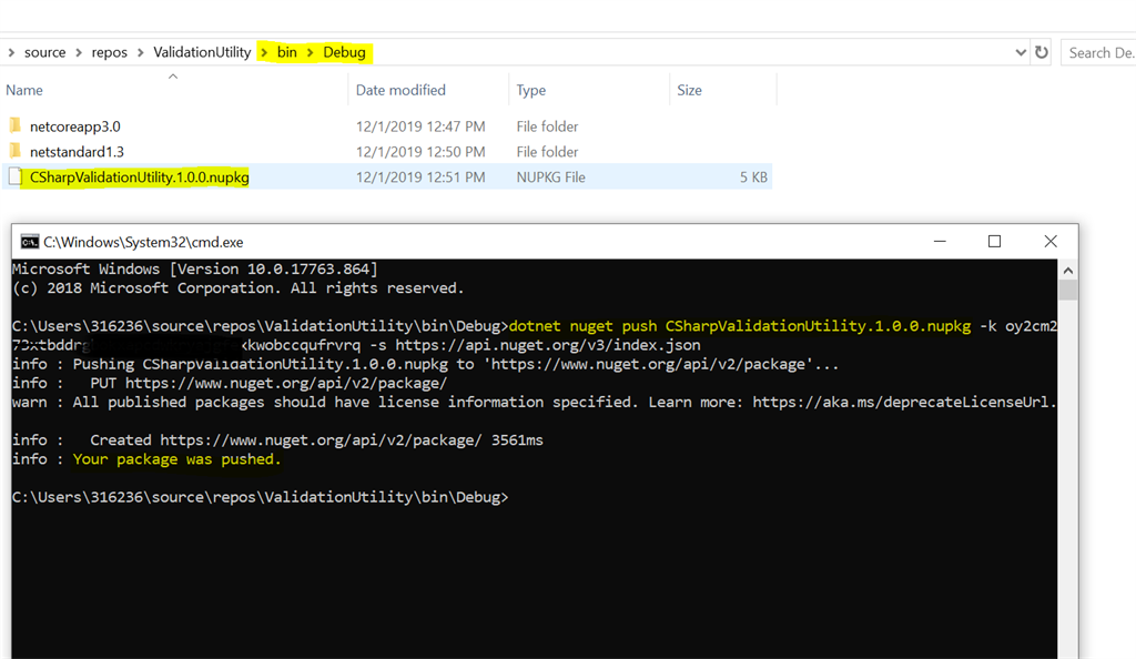 - dotnet nuget push CSharpValidationUtility.1.0.0.nupkg -k <API KEY> -s https: