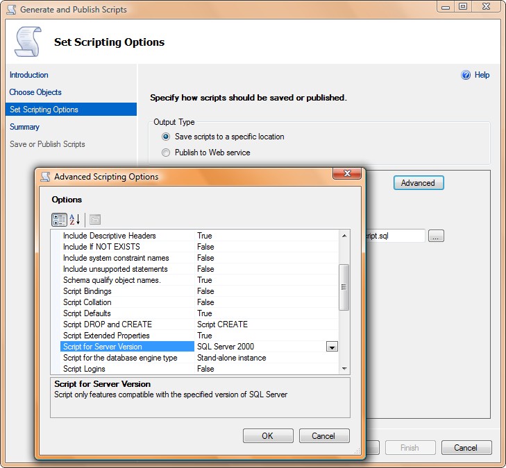 c. Script of SQL Version, set to SQL SERVER 2000