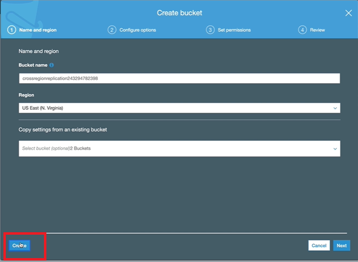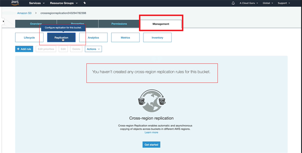 Let's enable the cross-region replication feature to a bucket. For that, please go to the properties of the bucket under the management tab click on the replication button. Please check the below snapshot.