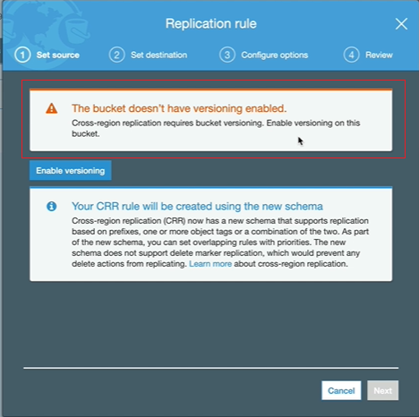 Let's enable the versioning for a bucket by clicking on the enable versioning button.