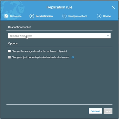 Let's configure the destination bucket. Please check the below snapshot where we can select the destination bucket. The destination bucket can be the same region or a different region.