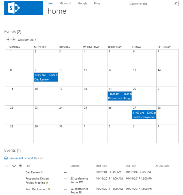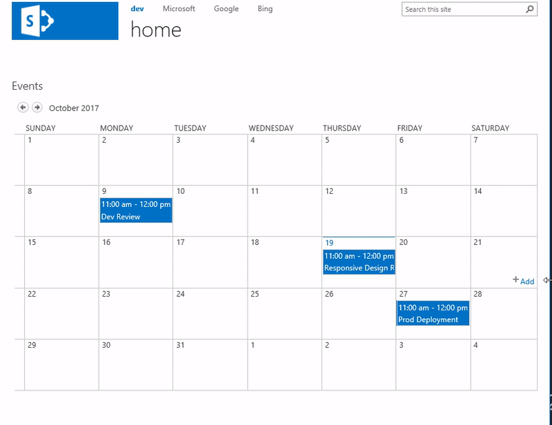 In this blog we will learn how to switch between the views based on the screen width using CSS without any need of JQuery or JavaScript. For this demo I will use calendar web part, each view is added as a webpart. Desktop version will show monthly calendar view, Mobile version will show current event list items.