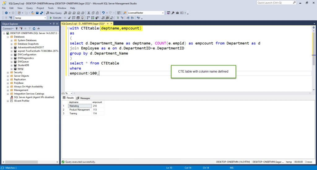 In the above query, you specify 2 columns, so remember you need to specify the columns that select query is returning. If our inner select query is returning 3 columns then you need to specify these 3 columns in CTE.