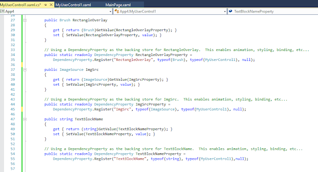 Now go to the back end file of this user control and add some dependency properties by just typing propdb and just press the Tab two times . Boom ! that's a new shortcut for creating a dependency property.