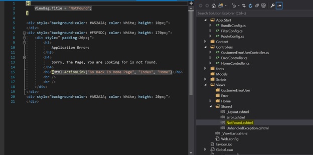 Go to View/Shared Folder; create two views named “NotFound.cshtml” and “UnhandledException.cshtml”