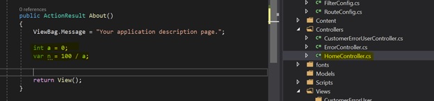 Since we are using [HanldeError] attribute, all the unhandled exceptions will be redirected to by default error page (Error.cshtml).