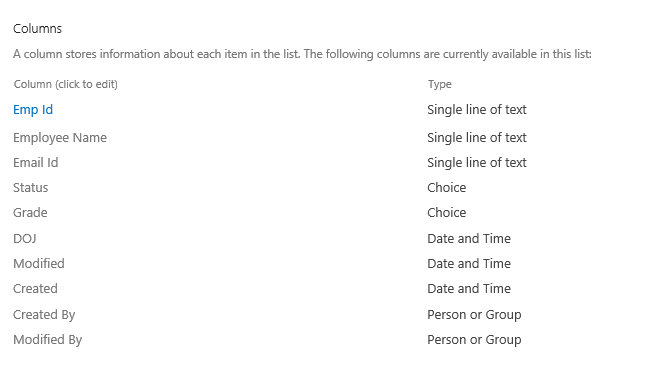 1. Go to setting and rename title column as Emp ID and create columns as shown in below table