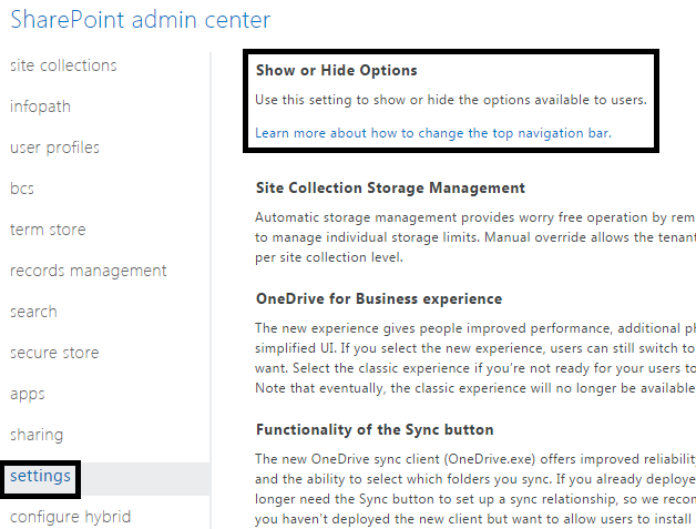 Similarly, you can select as Show or Hide if you want Sites Option to be visible and to be used by the users of your organization for creating new sites or view other sites.