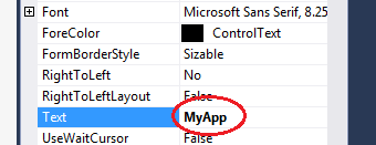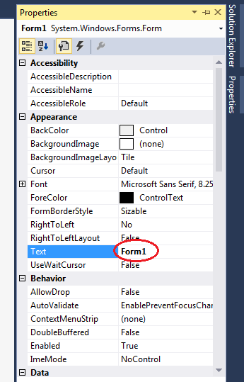 Here under Font there is property called “Text” by changing it we can change the Title of the window.