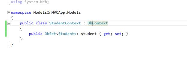 As the DbContext class is present in System.Data.Entitynamespace, StudentContext class is getting inherited from DbContext class. The purpose of this class is to establish a connection to our database.