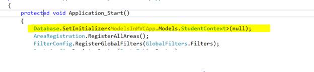 Thus, what is SetInitializer function? The purpose of setinitializer function is when you look at the intellisense. Basically, it is used to initialize the database, if you don’t have a database created. It will create a new database for you, create tables for you and populate some sample data as well.