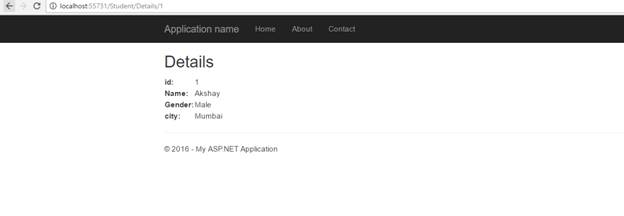 Notice, in the URL, we are passing an Id as 1 because we had specified in our action parameter as Id. Thus, it is retrieving the data, whose Id is 1, using a Single link method.