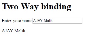 - <h1>Two Way binding</h1> Enter your name<input type="text" ng-model="name">