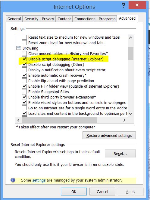- Enable the Debugging in the Internet Explorer - Go to Tools >> Internet Options (wizard will appear >> Click the 'Advanced Tab' >> Under Browsing Section uncheck the 'Disable script debugging' checkbox >> Click OK.|