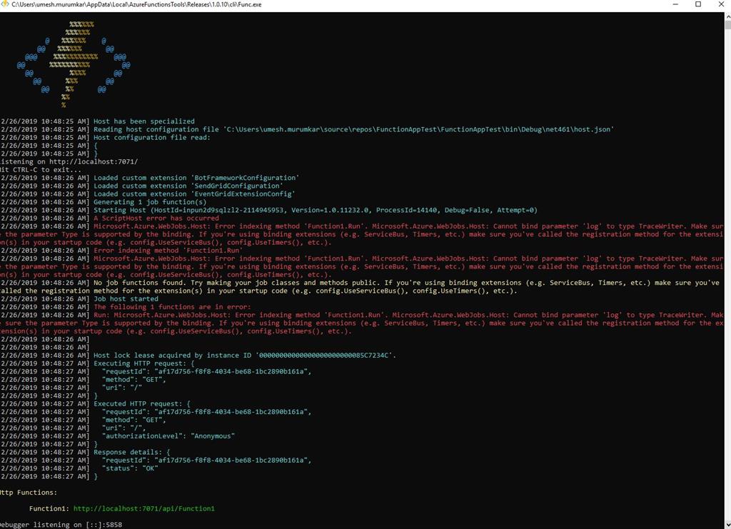 [2/26/2019 10:48:26 AM] Microsoft.Azure.WebJobs.Host: Error indexing method 'Function1.Run'. Microsoft.Azure.WebJobs.Host: Cannot bind parameter 'log' to type TraceWriter. Make sure the parameter Type is supported by the binding. If you're using binding extensions (e.g. ServiceBus, Timers, etc.) make sure you've called the registration method for the extension(s) in your startup code (e.g. config.UseServiceBus(), config.UseTimers(), etc.).
