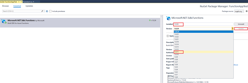 - Under the installed section in NuGet Window, select “Microsoft.NET.Sdk.Functions” package