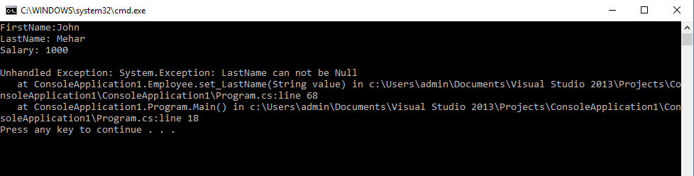 - The second problem is, in the real world the last name cannot be null or Salary cannot be negative, but in the above program, we can set _lastName to Null and _salary to negative value thus corrupting object of Employee. Also, we cannot restrict the user from assigning the negative value to _salary or Null value to _lastName to solve these issue C# comes up with Properties member.