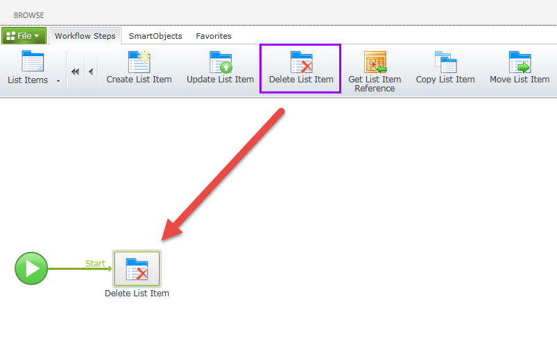 Go to K2 designer, drag and drop Delete List Item step from the List Item workflow steps in the ribbon interface.
