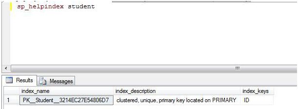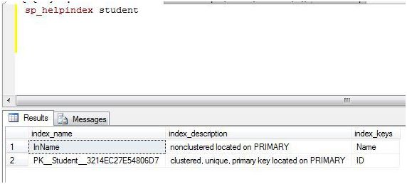 Execute the preceding script. Syntax for checking index on a table is given below.
