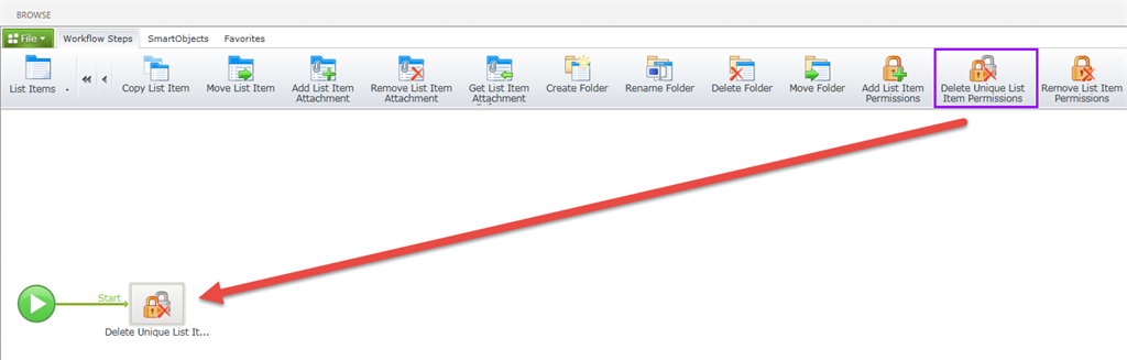 Go to K2 designer, drag and drop Delete Unique List Item Permissions step from the List Item workflow steps in the ribbon interface.