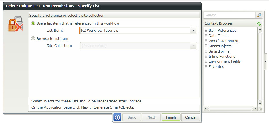 Specify the list for which you have to delete unique list item permissions and then click on Finish button.