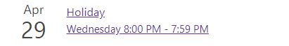 We will query the SharePoint calendar list using REST API and format the results using JavaScripts and CSS. We will then use Content Editor WebPart to display the result in a SharePoint page. This is a basic use of REST to get and display list items in SharePoint On-prem. When we are playing with date value than it gets a little interesting. Here is the result: