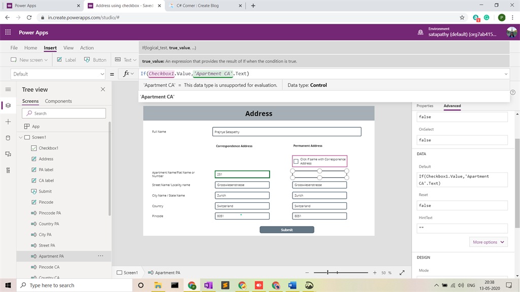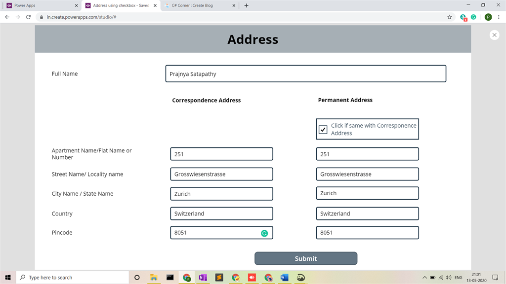 After this, when I play the Power Apps and type the correspondence address, it will automatically display the Permanent Address.