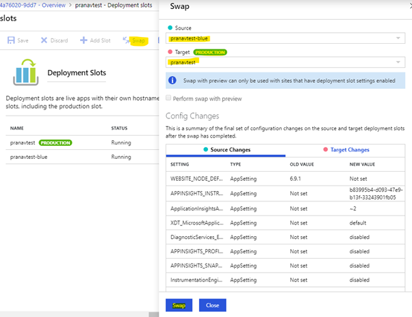 Let’s assume that you have pushed new changes to the new slot and you would like to redirect the production traffic to that code. Just click on the Swap button, select the slot, check the changes, and click on "Swap".