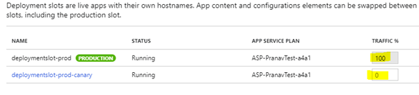 After the slot has been created, you will notice that the percentage of traffic which is going to the main slot is 100% while it is set to 0% on the slot which we just created -