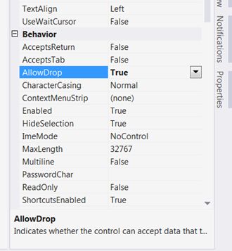 The method “.Data.GetDataPresent(DataFormats.FileDrop)” check if is a File droping. In case true, we set the effect to “Link”. Now we need to create event DragDrop on textbox: