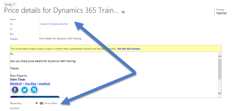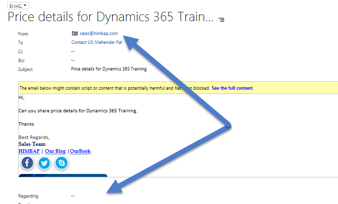 Now, I have created one contact with our sales team email address and I want to set "Regarding" to that contact. So, I look for this email address and after setting the "Regarding" field, as soon as I save the email form, it locks the "Regarding" field and makes the "From" field blank like the following.