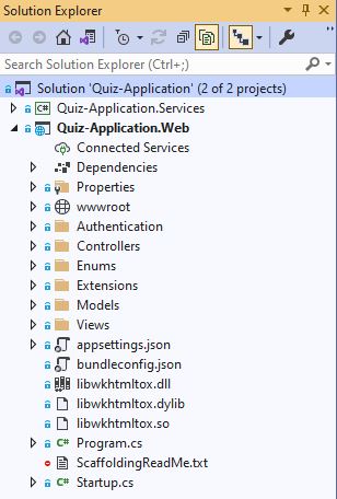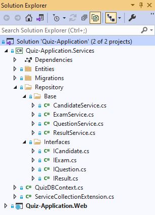 Quiz-Application.Web is the main ASP.NET Core project and Quiz-Application.Services contain all Entities. It is also used to access the database and write business logic. Quiz-Application.Services project can be accessed in Quiz-Application.Web project.