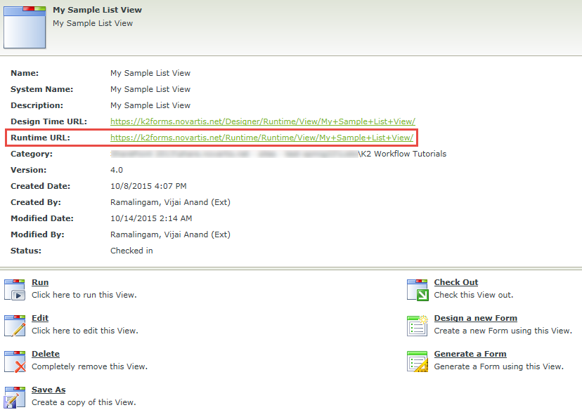 Navigate to the custom list. Click on List tab and then click on Application button under K2 section in the ribbon interface. Click on New and then click on View. In the category tree, expand K2 Designer, All Items, SharePoint 2013, <SiteName> => Lists=> K2 Workflow Tutorials, then My Sample List View. Click on Edit to edit this view. A pop up displays to check out the view. Please click on Yes button to check out the view. In the properties section expand Advanced and then select the checkbox for Anonymous Access.