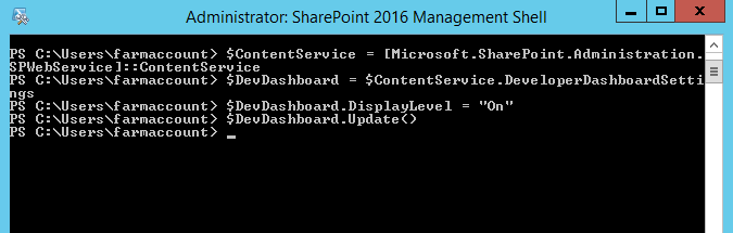 Once the usage and health service application is in place, we can run the below command to enable developer dashboard.