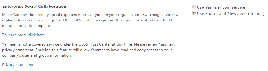 Here you can choose whether you want the default collaboration center for all the sites in your tenant to be through Yammer or the default Newsfeed functionality.