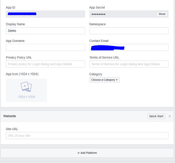 Then your app is created. Now you have to set the basic settings of the App. Then select "Platform" and click on "Web". Now you have to enter your "Site URL".