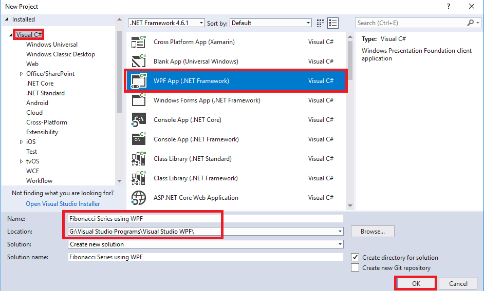 First, open Visual Studio then File->New->Project. Click on the project then a templates window will appear. Later, select Visual C# template->WPF App(.NET Framework). Then, set the name of the application and location of the application. Then click OK.