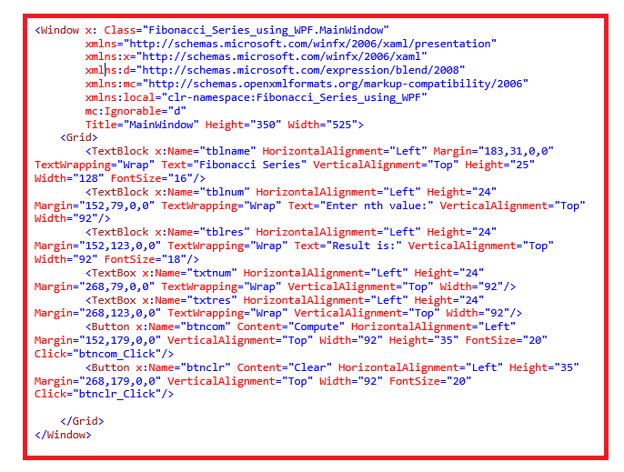 - <TextBlock x:Name="tblname" HorizontalAlignment="Left" Margin="183,31,0,0" TextWrapping="Wrap" Text="Fibonacci Series" VerticalAlignment="Top" Height="25" Width="128" FontSize="16" />