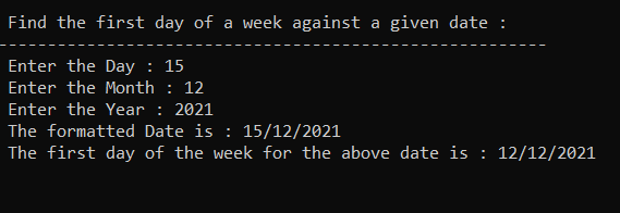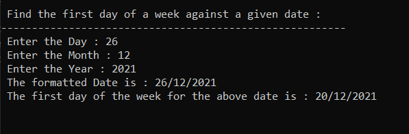Console.Write("\n\n Find the first day of a week against a given date :\n");