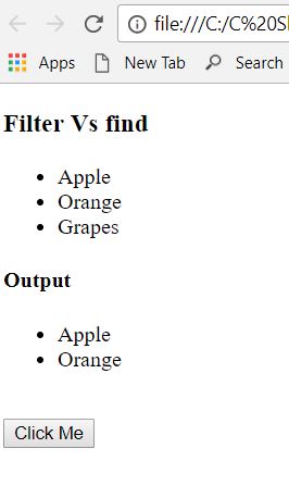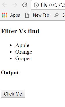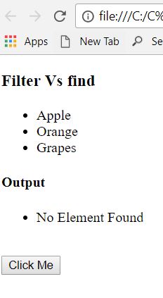 The above HTML page consists of three items in the list. In the jQuery, we used the selector ($name=$('#ulist li')) to select the li. From the selector, we found the li which consists of the class name as li ($name.find(".li")), but no element is selected using the Find function.