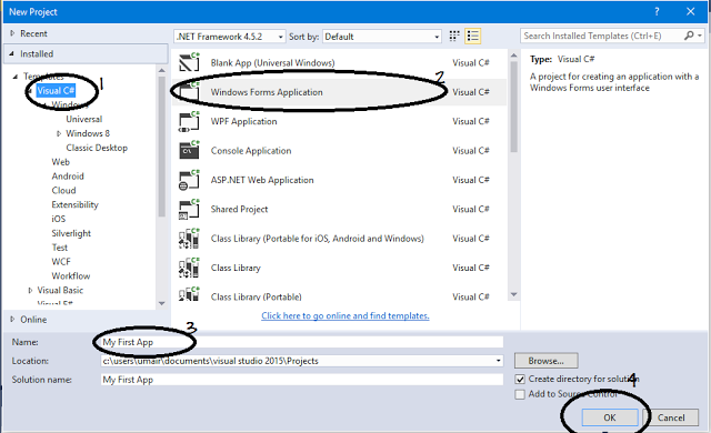 3-Than select visual c#. than click on windows form application and name it and click OK.