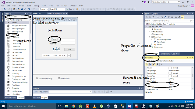 5- Drag Drop things from ToolBox according to your requirements as shown on left side.