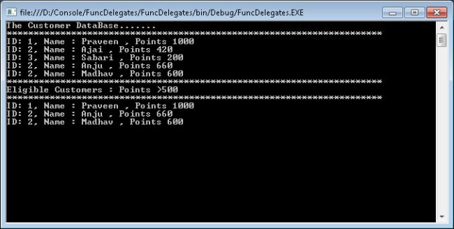 For each customer in the customer list, the Func delegate is invoked to check whether that customer is an eligible customer or not.