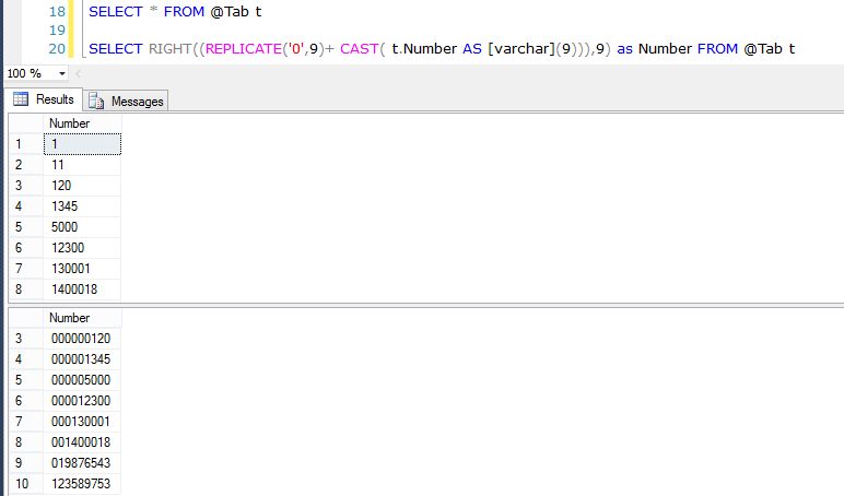 - SELECT RIGHT((REPLICATE('0',9)+ CAST( t.Number AS [varchar](9))),9) as Number FROM @Tab t